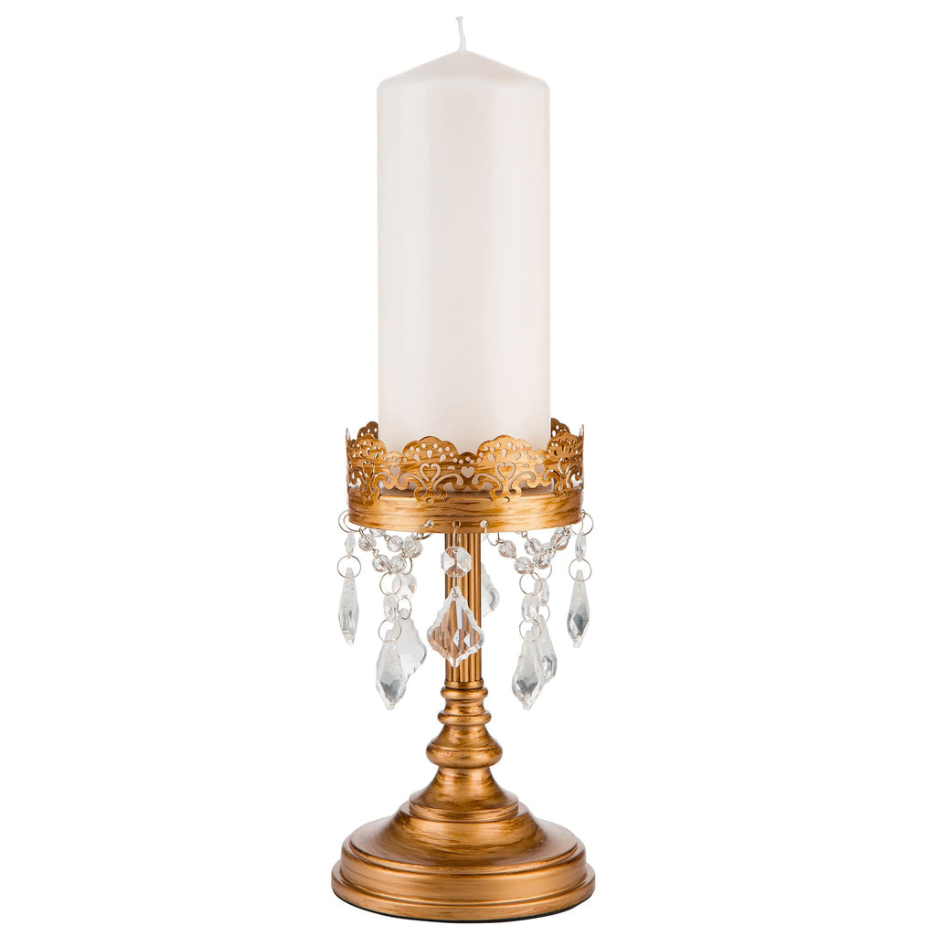 This exquisite piece from our Sophia Collection, holds one pillar candle and comes with a removable glass hurricane. The timeless elegance of this design features beautiful dangling crystals on the metal frame and brushed with an antique-style finish, a perfect compliment to the warm and graceful ambiance of the candlelight. Very sturdy and heat resistant.