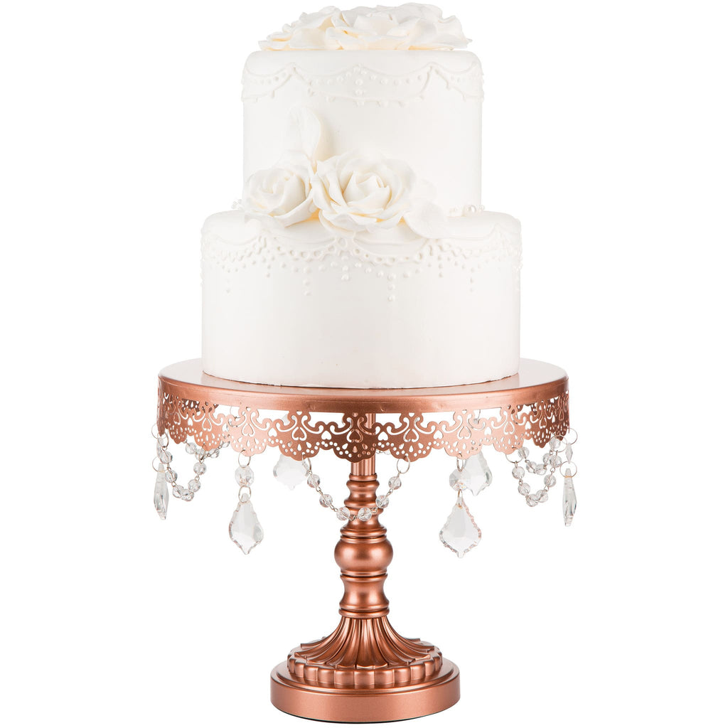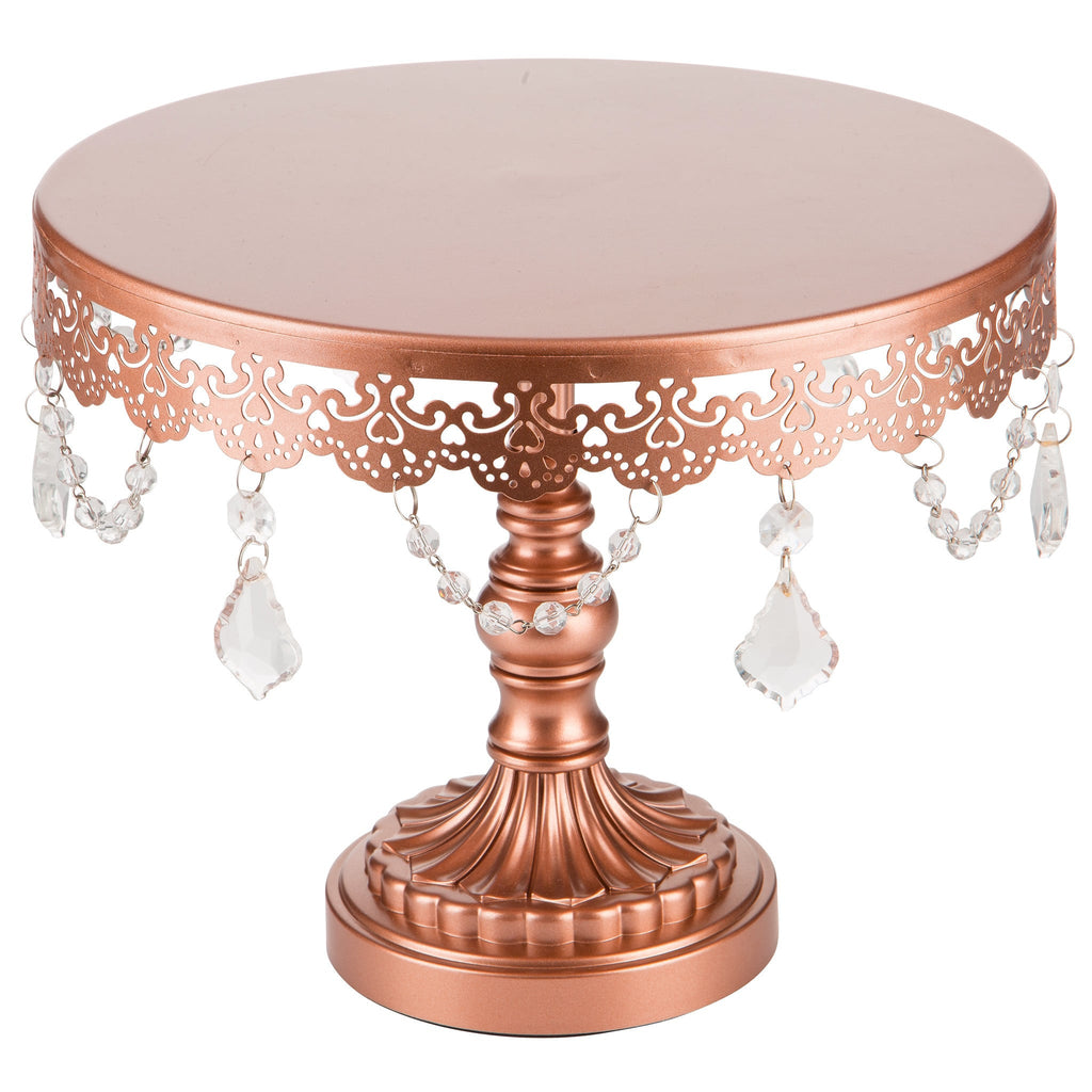 This rose gold, 10-inch cake stand is a part of our exclusive Sophia Collection and is hand-painted. The simple, yet delicate look of the stand perfectly complements any desserts or cakes. The design features a sturdy metal-crafted base and the plate is draped with beautiful glass crystal pendants. This dessert tand will transform any event, party, or wedding, making your desserts the center of attention. The packaging comes with 2 simple parts: the tray top and the base stand, which minimizes the space you will need for storage. Also available in other colors and as a 3-tier cupcake stand!