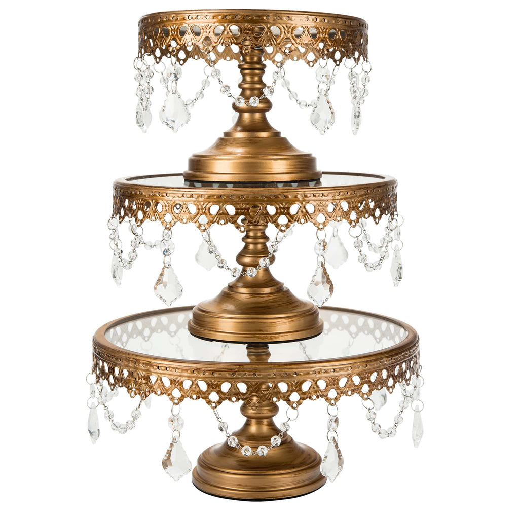 This stunning gold 3-piece set from our Victoria Collection will stand out at any wedding, birthday party, and event. The elegant design of the stands all feature a metal frame and weighted base that is brushed with an antique-style finish, and is draped with beautiful glass crystal pendants and beads. Complimented with transparent glass surfaces, giving it a chic look. The three different sizes of the cake stands makes it perfect to showcase any kind of cakes or desserts. *Pieces not sold separately.